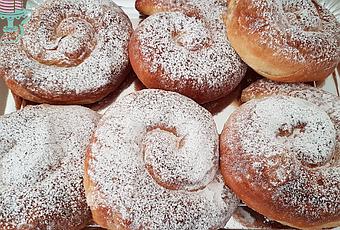 Dejamos fermentar en un lugar cálido y sin corrientes mínimo 12 horas, cocemos en horno precalentado a 190º con calor por arriba y por abajo unos 15 minutos, dejamos enfriar antes de cubrir con azúcar glas.