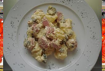 - 1.2 kg de patatas nuevas- 6 pepinillos en vinagre de tamaño mediano - 2 cucharadas de alcaparras en vinagre - 180 grs de salchichas de frankfurt (2 salchichas grandes) - 5 cucharadas de mayonesa - 3 cucharadas de mostaza de dijon - 3 cucharadas de nata liquida En primer lugar cocemos las patatas. Para ello las metemos con piel en una cazuela con agua y sal y dejamos que hiervan durante 40 minutos. Cuando esten cocidas las envolvemos durante media hora en papel de plata.