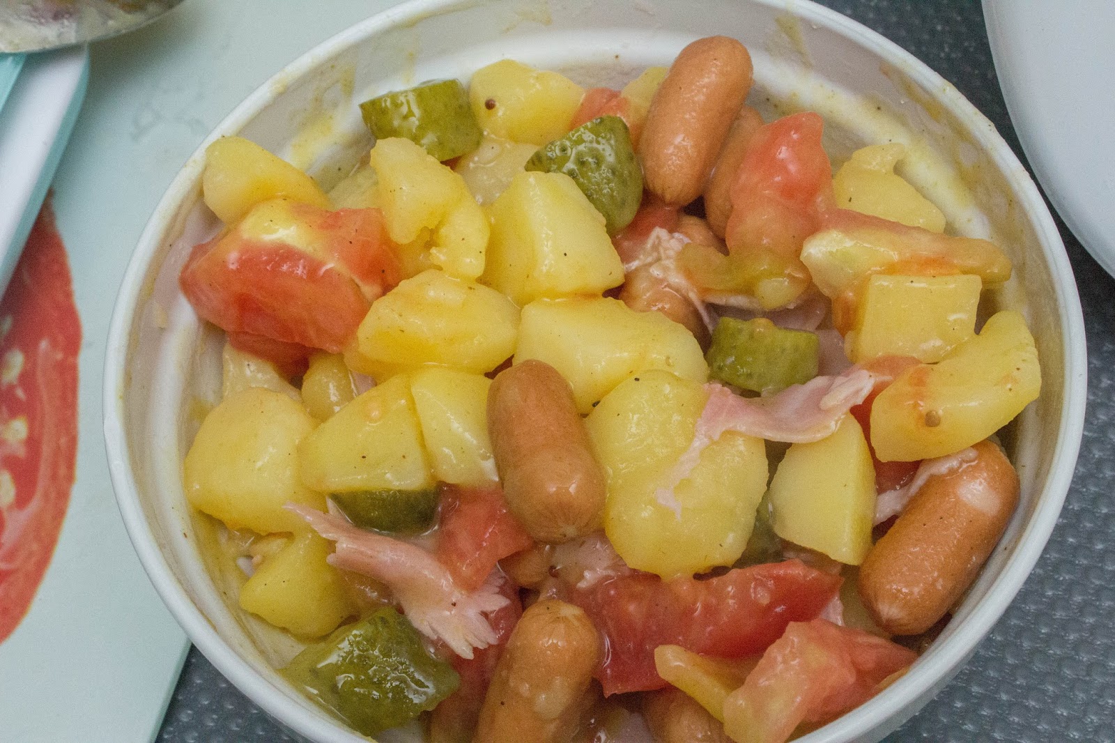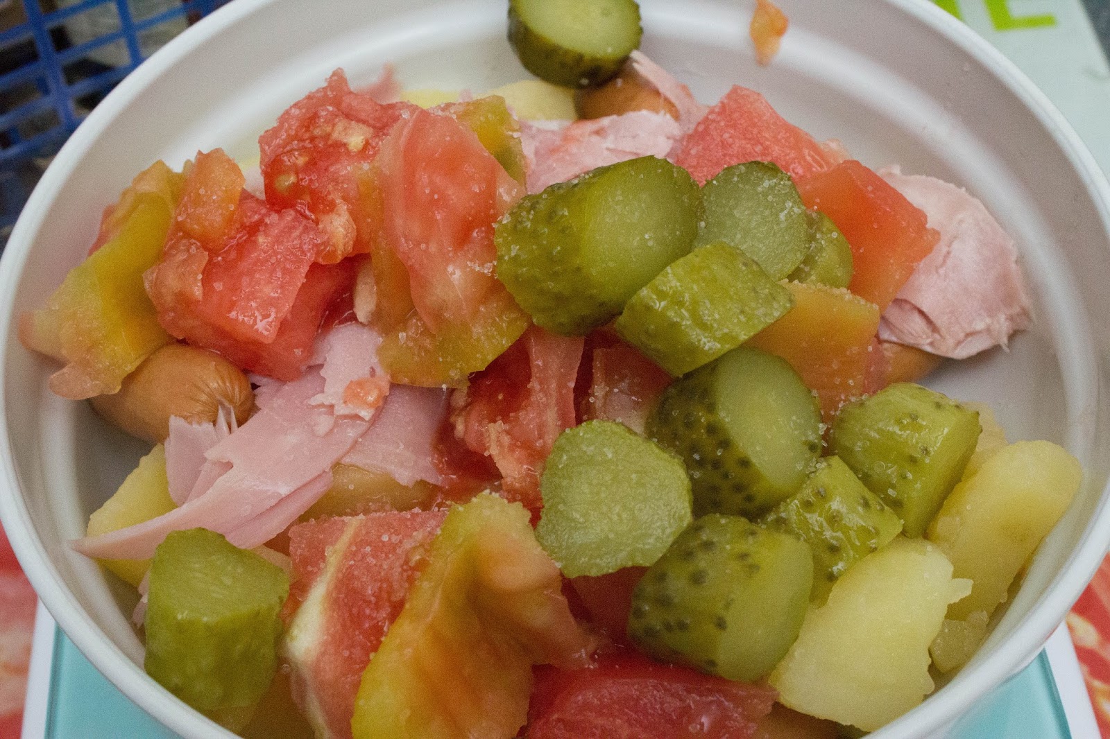 Hoy traigo una ensalada alemana light. Es una ensalada muy rica y completa, incluso para llevar de picnic.