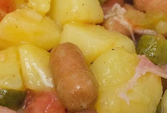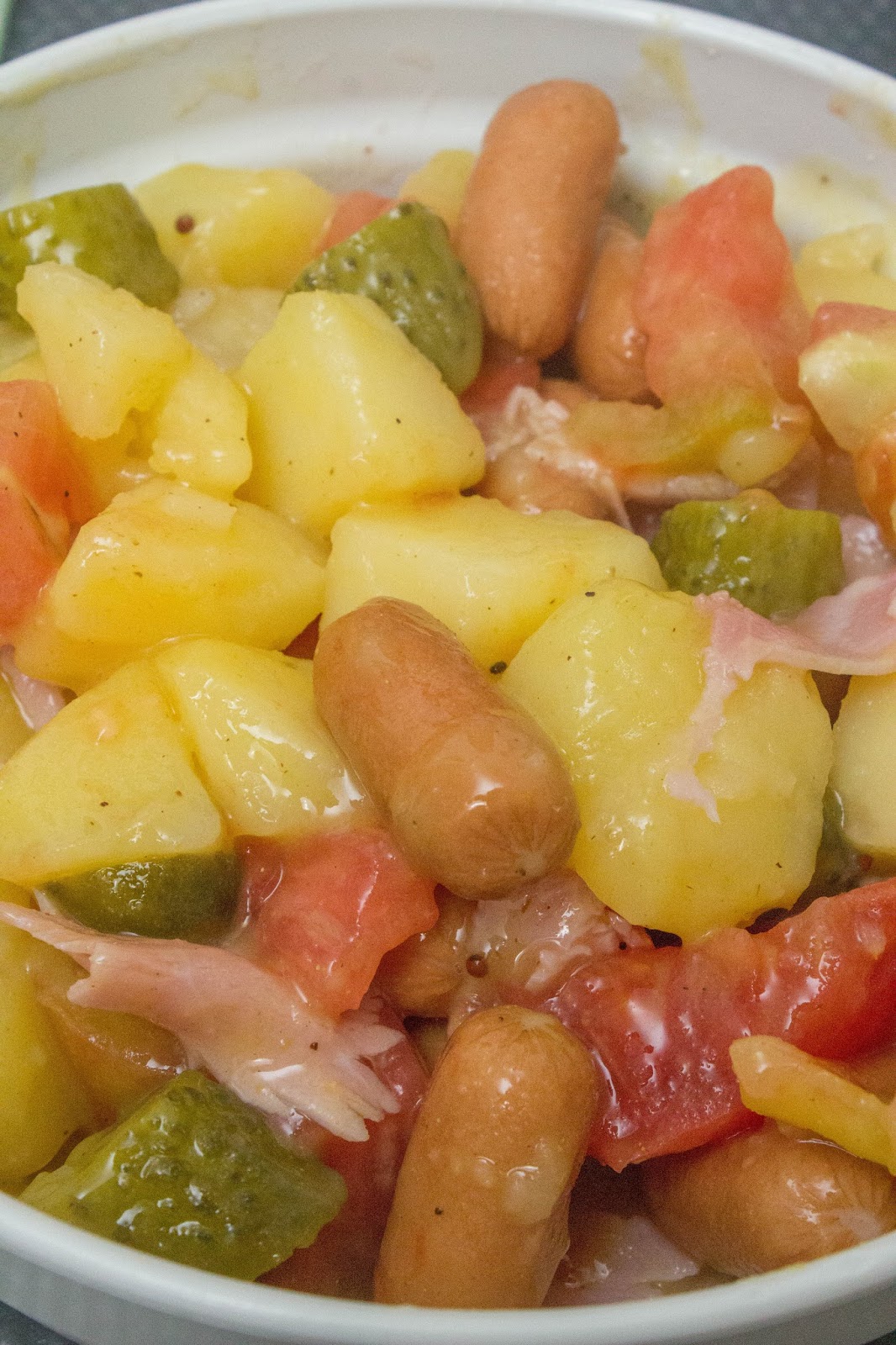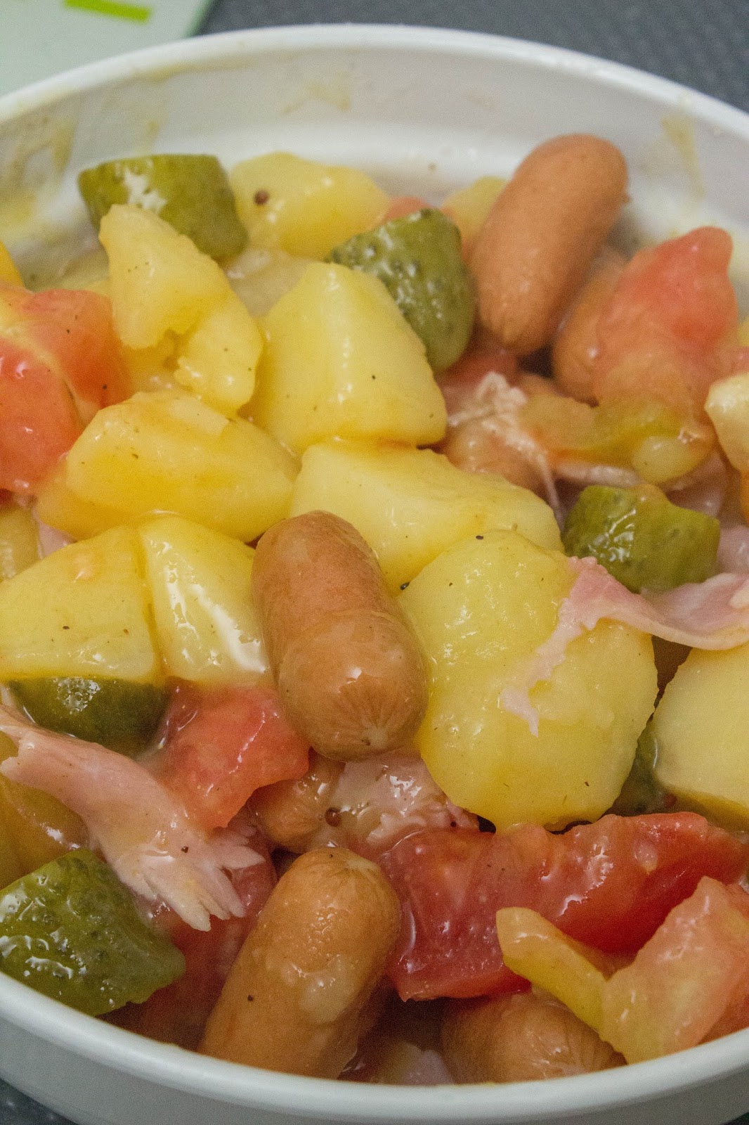 Ingredientes para 4 personas:800 g de patatas1 tarro de salchichas pequeñas20 pepinillos4 lonchas de jamón york1 tomatesalsa de mostaza y miel Natural Zero