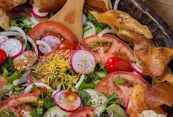 Echamos el aliño encima de la ensalada y removemos bien con dos cucharas. Decoramos con el pan de pita frito y espolvoreamos con el sumac.