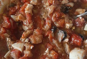 INGREDIENTES: (4 personas) 2-3 pimientos rojos asados puerro pequeño 3-4 tomates asados o un bote de tomate entero o a trozos 1-2 dientes de ajo, pelados y picados o ajo en polvo Un puñadito de perejil de hoja lisa (tallos y hojas por separado) 1 c/p colmada de orégano seco 12 aceitunas verdes y/o negras sin hueso 1 cucharada de alcaparras 2 c/s de vinagre de manzana