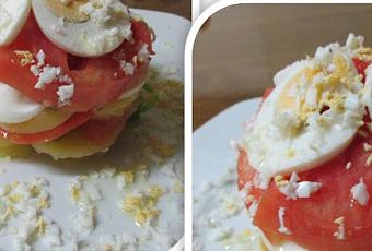 Escurrimos las patatas una vez cocidas dejamos enfriar un poco y se la añadimos al bol con los pimientos y la cebolla, los tomates los cortamos en rodajas.