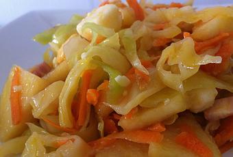 Pelamos y rallamos las zanahorias y se lo añadimos al repollo.