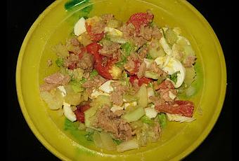 Ingredientes:- 2 patatas medianas.- 1 tomate.- ½ pepino.- 4 hojas de lechuga.- 2 latas de bonito.- ½ cebolla.- 2 huevos cocidos.- Pimiento (opcional).- 4 cucharadas de aceite.- 2 cucharadas de vinagre.- Sal y pimienta negra molida.Elaboración:Cocemos las patatas y los huevos, las patatas dependerá del tamaño pueden tardar de 25 a 45 minutos y los huevos son 10 minutos. Pelamos y cortamos en rodajas será la base de nuestra ensalada. Luego añadimos el tomate, el pepino, la cebolla y si hemos decidido poner pimientos también los cortamos y lo echamos a la ensaladera. Por último, escurrimos la lata de bonito y se la añadimos a la ensalada.Luego realizamos nuestro aliño con el aceite, el vinagre, la sal y la pimienta y lo echamos en nuestra ensalada y ya está lista para servir.