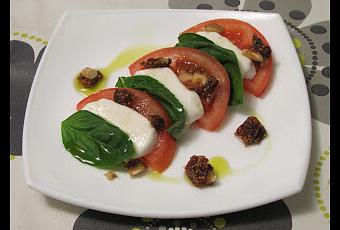 Hoy preparamos esta ligera receta de la famosísima ensalada caprese italiana, pero con el añadido de unos taquitos de pan mediterráneo hecho a base de higo, dátil, ciruela, almendra, nuez, canela y un toque de anís. ¡La combinación está riquísima!