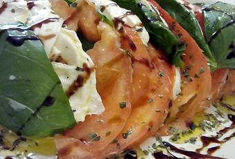 4 tomates, 400 gr. de mozzarella de bufala, albahaca, orégano, vinagre balsámico, sal y aceite.