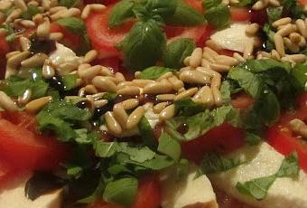 La ensalada Caprese es una de las recetas más fácil y rápida de preparar que conozco y que además está deliciosa. Se trata de una sencilla receta de ensalada cuyos ingredientes básicos son el queso mozzarella fresca, el tomate, la albahaca fresca (de la variedad hoja grande) y aceite de oliva virgen. Es un plato delicioso y muy vistoso, pues los colores de los ingredientes originales nos recuerdan a los de la bandera italiana, país de donde es originaria –concretamente de Capri- (el rojo del tomate, el verde de la albahaca y el blanco de la mozzarella). A partir de estos ingredientes que componen la receta tradicional, se le pueden agregar otros muchos dependiendo de nuestros gustos y de nuestra imaginación (pimienta, aceitunas, aguacate…etc). En este caso le he añadido unos piñones tostados y una crema de vinagre balsámico. El resultado ha sido espectacular.