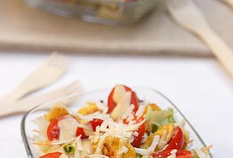 Hacía mucho tiempo que no la preparaba y gracias a que me llegaron unas harinas especiales "Yolanda" me acordé de ella. Quise probar el rebozado del pollo con esta harina tan especial que no necesita de huevo para su rebozado. Nos ha encantado el toque crujiente que ha dejado la costra del pollo. Absolutamente recomendable, además evitamos el engorro de tener que empanar el pollo y utilizar mil cuencos para ello. Nosotros en casa la hemos degustado en la cena como plato único y con el que, pese a ser una ensalada, te sacia.