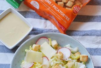 Hace unos días os contaba lo que había traído la Degustabox de este mes, y si os acordáis, venían dos bolsas de picatostes de la marca Rialto que me pusieron ojitos en cuanto los vi. Creo que los picatostes o croutons de pan son muy versátiles en nuestras cocinas, se pueden añadir al gazpacho una vez servido, a alguna crema fría o caliente o, como es mi caso, hacer una ensalada deliciosa y refrescante como esta ensalada cesar con escarola.
