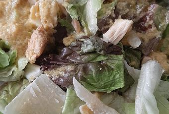 Poner encima las lascas de parmesano, el pollo (yo he puesto restos de pollo asado), el pan frito de la receta tradicional yo lo he sustituido por torreznos en trocitos y la clara de huevo reservada y troceada. Regar la ensalada con la salsa.
