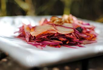 Ingredientes:500 gramos de repollo morado o lombarda.2 zanahorias medianas.2 manzanas pequeñas, yo utilicé Royal Gala.1/2 cebolla morada.50 gramos de uvas pasas sin pepitas.25 gramos de nueces.4 cucharadas de aceite de maíz.2 cucharadas de vinagre de manzana.1/2 cucharadita de canela en polvo.Sal al gusto