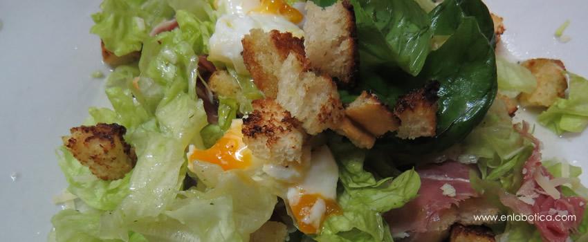 Lavé y escurrí la lechuga y albahaca. Las corté con la mano en trozos medianos. Rallé queso magro y colo coloqué sobre las hojas verdes, a eso le agregué el jamón crudo cortado en trozos pequeños (y también con la mano). Agregué una viangreta de Knorr (no recuerdo cual era sorry!) que ya tenía aceite de oliva, añadí los croutons y sobre todo coloqué el huevo que saqué con mucho cuidado del papel film, recuerden aceitarlo pues sino se pega. Corté el huevito y mezclé. Quedo DELICIOSA!!!!!!!Y que les pareció esta receta más saludable? Quieren que sigan publicando otras?Hasta el próximo post!, xoxo