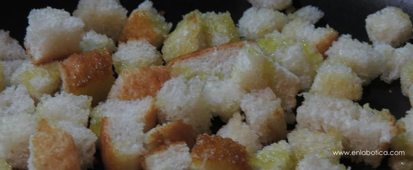 Para los croutons corté las dos fetas de pan en cuadraditos pequeños y los llevé en una fuente (previamente un poco aceitada) al horno (moderado), condimentando a gusto. Cada pocos minutos cuidé de remover los croutons para evitar que se quemaran de un lado. Una vez dorados los saqué del horno y dejé enfriar. Pueden guardarse por un par de días en un recipiente hermético.Huevos poché