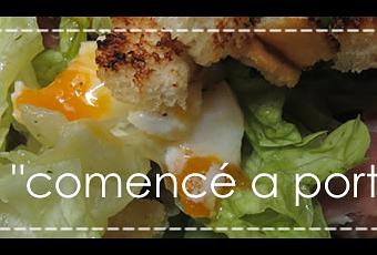 Para hacer esta versión de los huevos utilicé la receta más fácil que consiste en forrar una taza con papel film (varias capas - 2 ó 3), dejando un excedente como para poder hacer una bolsita y cerrar. Aceité ligeramente el papel film y allí coloqué un huevo crudo, salpimenté (pueden agregarse otros condimentos) y cerré (tratando que no quede aire en el interior) con mucho cuidado y con una cintitita para usar en cocina. Coloqué los huevos con cuidado en una olla con agua hirviendo y los cociné por 4 minutos. Una vez cumplido el tiempo saqué cada uevo con mucho cuidado y los puse en agua fría para cortar la cocción, y ahí los dejé mientras armaba la ensalada.Ensalada
