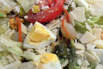 1 bolsa de lechuga ya cortada (mix)1 tomate medianoUn puñado de pepinillos Un puñado de cebolletasMaiz en conserva4 huevos cocidosQueso parmesano en lascasZanahoria ralladaSalAceite de olivaVinagre de modena