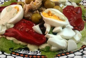 Lechuga: 100 gramos.Huevo: 2.Aceitunas verdes.Pimientos del piquillo: 4.Bonito en aceite: 200 gramos.Aceitunas negras.Para la vinagreta de hierbas:Salsa mayonesa: una cucharada.Mostaza de Dijon: 2 cucharadas.Leche: 2 cucharadas.Estragón seco: una cucharadita.Albahaca seca: una cucharadita.Perejil seco: una cucharadita.Orégano: una cucharadita.Alcaparras: 3.