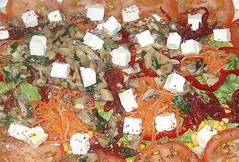 En el centro de la bandeja puse la lechuga cortada en juliana. Alrededor el pepino cortado en aros y encima los tomates. Sobre la lechuga el maíz dulce y sobre éste, el pimiento rojo cortado en aros también. Rellené el centro del pimiento con zanahoria y remolacha. Es ahora cuando puse los champiñones que tenía reservados y luego el queso.