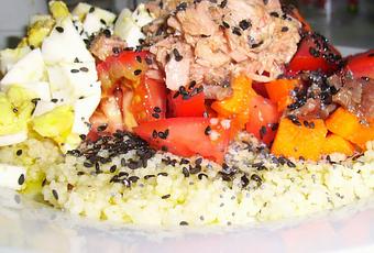 Para el cus cus estad atentos. Para cocinarlo hay que poner aproximadamente la misma cantidad de agua que de cus cus. Yo para cocinarlo suelo poner agua en un vaso, lo meto al microondas hasta que hierva, le pongo un poco de sal, añado el cus cus y tapo el vaso. En un par de minutos el cus cus habrá absorbido todo el agua. Para que os salga mas o menos bien así podéis medir primero el cus cus en un vaso para ver cuánto ocupa, retirarlo y añadir el mismo volumen de agua, aproximadamente.Ahora podemos trocear unas cuatnas anchoas (las que vosotros queráis), al igual que el atún en lata. Hecho esto podemos mezclarlo todo, añadimos un poco de sal y de aceite. Yo además le puse sésamo negro y semillas de amapola, que quedan bien con casi todo.