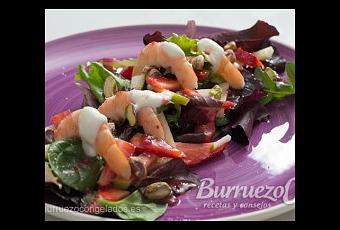 Repartir las frutas sobre los brotes tiernos, colocar cinco langostinos pelados, un poco de sal, la vinagreta preparada y unas trazas de yogurt griego batido. Coronar con los pistachos pelados.