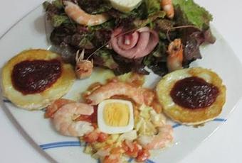 Con la loncha de jamón, hacemos una flor, y la ponemos en medio de la lechuga, ponemos a los lados dos rodajas de queso, con la cucharadita de mermelada encima.Cortamos el huevo en dos, y ponemos medio en cada lado del plato, pelamos los langostinos y repartimos por el plato, colocamos dos cabezas adornando el plato.