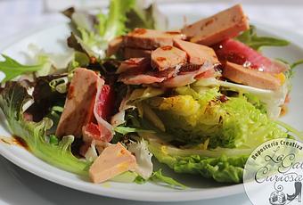 Una bolsa de lechugas variadas para ensalada100 Jamón a ser posible ibérico y cortado fino150 gramos de foie micuit, yo he empleado el de Lidl, 2 cucharadas de mermelada de fresas100 ml de aceiteVinagre balsámico al gustoSal
