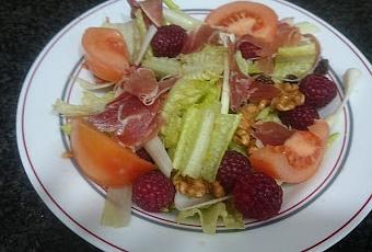 Esta receta es de la revista hola de recetas. E s una revista que me encanta coleccionar tiene recetas muy originales. Vi esta deliciosa receta y decidí probarla esta exquisita y muy sencilla de elaborar.INGREDIENTES:100 g de lechuga variada80 g de jamón en lonchas50 g de nuecesPimienta20 g de pasas sultanas1 cebolleta2 tomates½ vaso de oportoSal150 g de frambuesas100 ml de vinagre de jerezAceite de oliva virgenELABORACIÓN.Lavaremos la mitad de las frambuesas y las trituraremos 1 minuto con la batidora eléctrica junto con el vinagre. Dejaremos reposar toda la noche en la nevera y la colaremos al día siguiente luego, dejaremos las pasas en remojo con oporto unos 20 minutos para que se ablanden. Lavaremos las hojas de ensalada y las secaremos. La limpiaremos la cebolleta, eliminando la primera capa. Laváremos y cortaremos en tiritas. Lavaremos los tomates los secaremos y cortaremos en gajos. Para montar la ensalada, colocaremos una base de las hojas de ensalada. Las lonchas de jamón, las pasas escurridas el resto de las frambuesas lavadas y secas la cebolleta, los gajos de tomate las nueces y las distribuiremos sobre la ensalada. Aremos una vinagreta mezclando la sal el vinagre de las frambuesas y el aceite de oliva y aliñamos la ensalada.