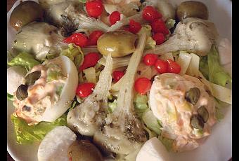 - Disponer sobre la cama de lechuga y cebolla las alcachofas (partidas por la mitad), los rabanitos (pelados y trocedados), las aceitunas, los huevos rellenos y las lágrimas de pimiento de La Pastora. Mantener en frío hasta comer.