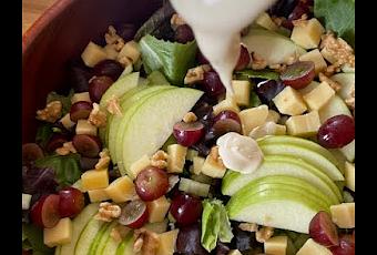 - 150 gr Ensalada variada- 2 manzanas verdes , Granny Smith- 14 gr de Apio en trocitos 8 1 ramita)- Uvas tintas sin pepitas. 1 puñado Nueces- 100 gr Queso en taquitos