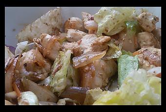- Pasado el tiempo estimado, extraemos el pollo y la cebolla de la sartén y lo añadimos a la ensaladera.