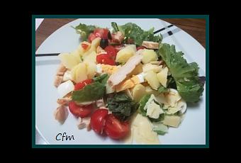 -Mezcla de lechugas-Tomates cherrys-Patatas baby cocidas (RECETA)-2 huevos duros (RECETA)-2 sollomillos de pollo a la plancha-Unas lascas de queso curado-Aceitunas negras-Aceite de oliva-Vinagte rojo-Sal
