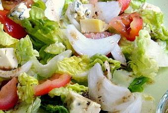 - Ensalada con lechuga, tomate, cebolleta y queso Bavaria azul.