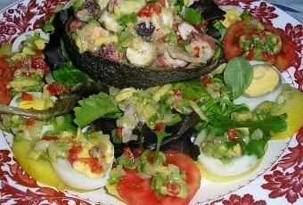 - En medio ponemos las lechugas variadas y sobre ellas la cascara de aguacate rellena de la vinagreta de pulpo. Añadimos a las verduras un poco de vinagreta a la que habremos quitado los trozos de pulpo.