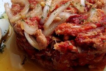 - Colocar los pimientos en una ensaladera y añadir 1 lata de atún en aceite, 1 cebolleta cortada en juliana y 2 huevos duros laminados. Aliñar con sal, aceite de oliva virgen y vinagre. Mezclar bien y servir.