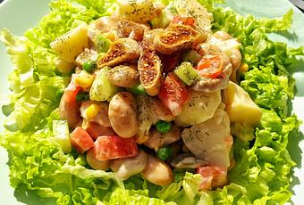 ♥ 5-6 patatas♥ 150g de judías blancas o 1 bote de judías cocidas♥ ½ taza de guisantes♥ ½ taza de maíz♥ 4-5 champiñones♥ ½ pepino♥ 1 tomate♥ lechuga