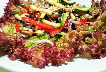 - Cortamos la lechuga, la colocamos en un plato. Servimos encima las verduras marinadas y espolvoreamos con las semillas de sésamo. Aliñamos con la vinagreta según gustos.