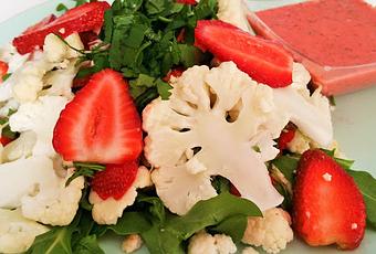 Para la ensalada:♥ medio manojo de rúcula♥ 12-15 fresones♥ 1/3 de coliflor (6 ramilletes grandes)♥ ¼ manojo de cilantroPara la vinagreta:♥ 7-8 fresones♥ 1 cdta de cebolla en polvo♥ 1 diente de ajo ♥ 2-3 cdas de vinagre balsámico♥ 3 hojas de albahaca fresca♥ 1 cucharadita de orégano seco♥ ½ cdta de stevia♥ ½ cdta de sal♥ pimienta- Laminamos la fresa y los ramilletes de coliflor, cortamos la rúcula y el cilantro.