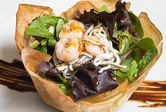 Montar la ensalada en el momento de servir, rellenado la tulipa con los brotes, sazonando ligeramente, y terminando con las gambas, gulas y ajos laminados, aliñar con unas cucharadas de vinagreta.