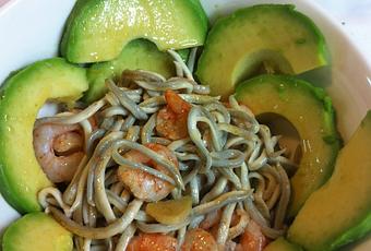 Se corta el aguacate en láminas. Se presenta en un bol con las láminas de aguacate en las paredes y en el interior las gulas y las gambas con el ajo laminado. Se salsea con la salsa vinagreta y se sirve.