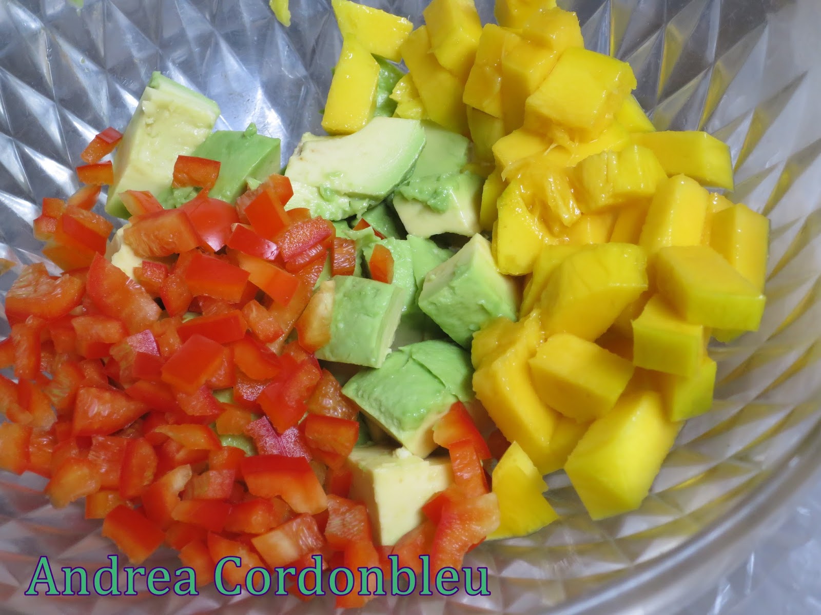 10 gambones 1 aguacate grande1 mango maduro Unas alcaparrasZumo de una naranja1 pimiento rojo SalMostaza de Dijon ELABORACIÓN:Se corta el aguacate por la mitad, se le quita el hueso y se corta en dados como muestra la fotografía. Se saca con ayuda de una cuchara.