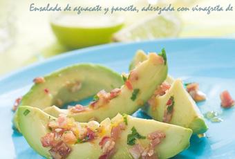 Ensalada de aguacate y panceta, aderezada con vinagreta de perejil