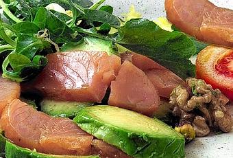 - Emplatamos poniendo primero las hojas de ensalada y sobre ellas el aguacate, el salmón ahumado, el tomate y las nueces. Aliñamos con el aceite de oliva y servimos.