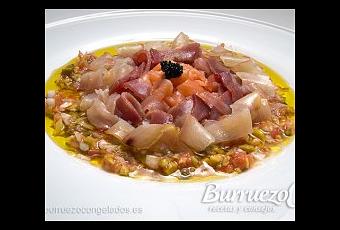 En un plato de servir, disponer de una cama de la mezcla preparada y sobre esta, las tiras o laminas de pescado ahumado. Presentar con un poco de caviar negro o similar.