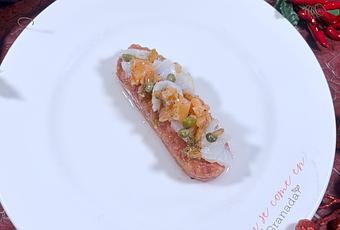 - Para servir se pone una cama del tomate mezclado y sobre esta los ahumados terminando con unas alcaparras por encima.