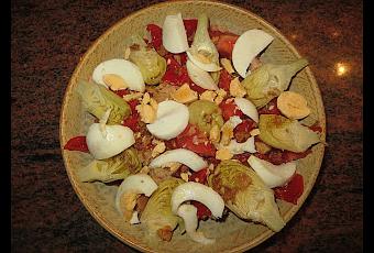 Elaboración:Lo primero que hacemos es poner a cocer los huevos, echamos a una cacerola agua son sal y cuando empiece a hervir echamos los huevos y los dejamos durante diez minutos. Mientras tanto pelados y cortamos en trozos grandes el tomate, cortamos en dos trozos las alcachofas, escurrimos la lata de atún y cortamos en trozos los pimientos.Colocamos primero el tomate, luego esparcimos el atún, los trozos de pimiento, cortamos en cachos en huevo duro, ponemos la alcachofas por encima y esparcimos una cucharada sopera de cebolla frita, salamos, echamos aceite y vinagre y a comer.