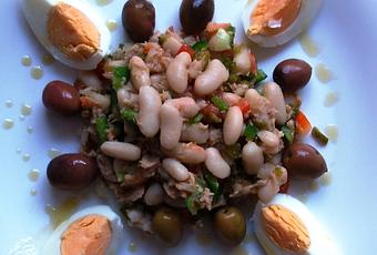 Ingredientes:- 400 grms. de alubia cocida- 1 cebolla pequeña- 1/2 pimiento italiano- 1/2 pimiento rojo pequeño- 100 grms. de pepinillos en vinagre- 1 tomate de ensalada- 1 lata grande de atún- 60 cl. de aceite de oliva- 4 huevos duros- Aceitunas- Sal al gustoPreparación:Poner las alubias en un recipiente al que le iremos añadiendo, cortado bien pequeño la cebolla, el pimiento italiano, el pimiento rojo, los pepinillos y el tomate. Añadir el atún desmigado. Sal al gusto.Preparar una vinagreta batiendo el aceite y el vinagre y añadirlo a lo anterior mezclando con cuidado.Preparar los platos y adornarlo con el huevo duro y las aceitunas.Servir frío