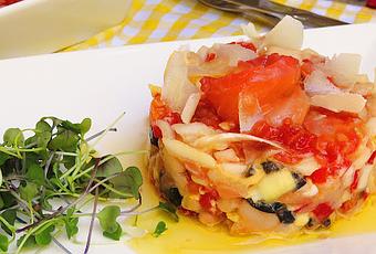 A la hora de emplatar, con ayuda de un aro, hacer una torre, repartir lascas de queso parmesano, regar con vinagreta de tomate y acompañar con mini brotes.