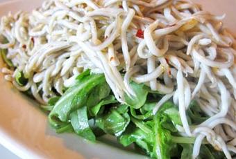 Cogemos las angulas y las colocamos en un escurridor y las lavamos con agua fría, las dejamos escurrir hasta que se encuentren bien secas, colocamos una pizca de sal al gusto.