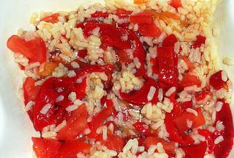 - pimientos rojos asados- tomate.Tan simple como cortar el tomate y el pimiento. Mezclar con el arroz y aliñar a nuestro gusto.Si os gusta más fría, guardar en la nevera hasta la hora de servir.