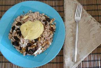 Mezclamos el arroz con el huevo, las pasas, las nueces y le añadimos la salsa et voilá!! Ya teneís lista una deliciosa ensalada de arroz al curry; yo ya la he llevado a unas cuantas barbacoas y ha sido todo un éxito, así que animaros a probarla